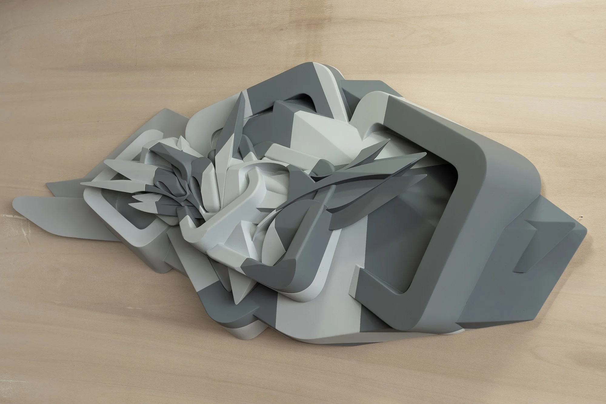 It’s a unique piece, part of the design is derived by the popular series of scultpures “Lander”. The central abstract and letter shapes are made of polyurethane resin while the larger structure in the back is made of PVC, reinforced with carbon fiber layers.