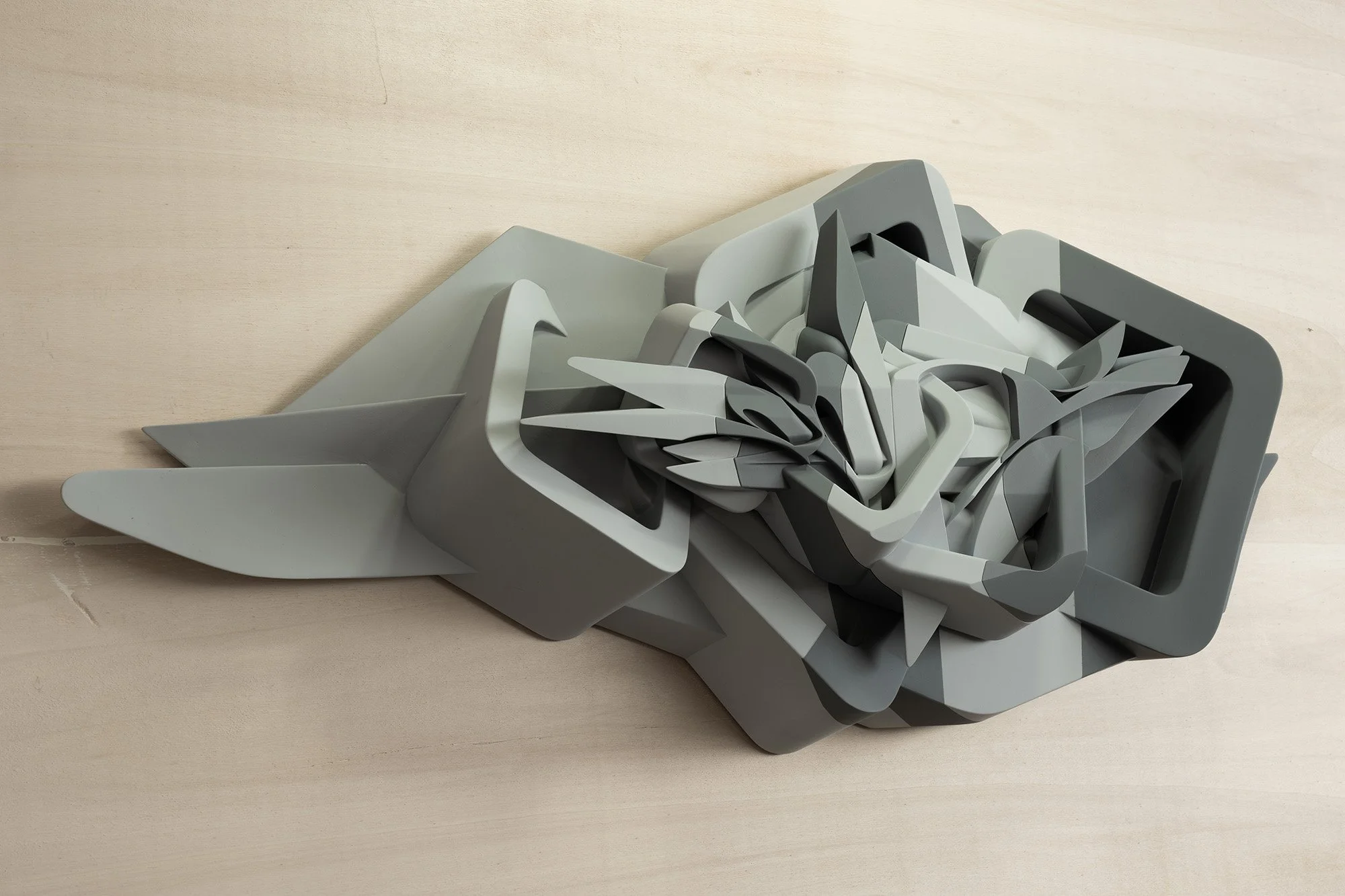 This self standing sculpture approximately 70 cm tall is an assembly of diffrent parts made of different materials. The large cube like shape is a hollow structure made of PVC reinforced with carbon fiber layers. The more complex shapes on top of it are made of 3D printed parts and an assembly of polyurethane resin castings.